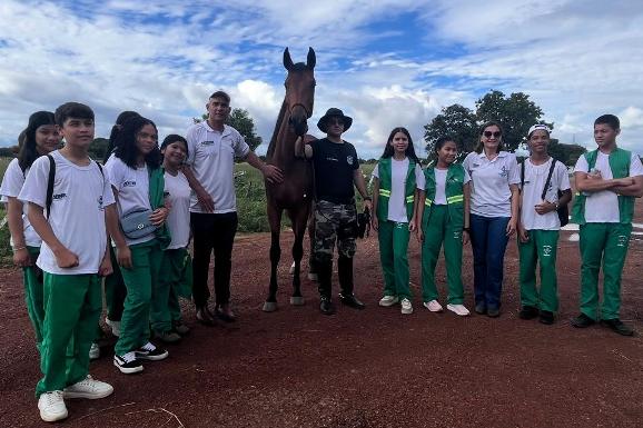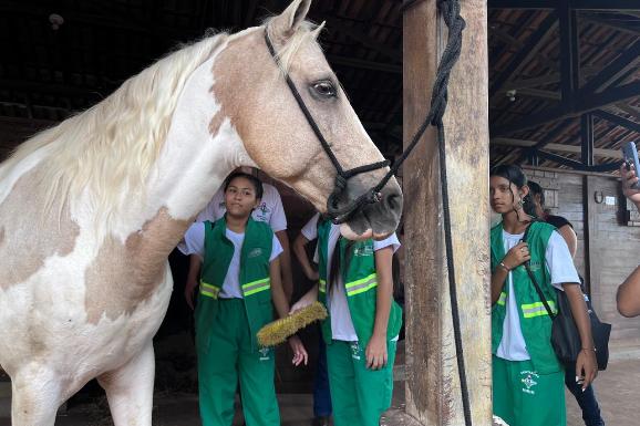 Durante a visita, os alunos puderam observar de perto a estrutura das baias, conhecer os cuidados com alimentação, higiene e manejo dos cavalos utilizados pela PMRR. A interação direta com os animais foi orientada por profissionais especializados da Aderr, o que contribuiu para a formação de vínculos de respeito e afeto pelos cavalos.