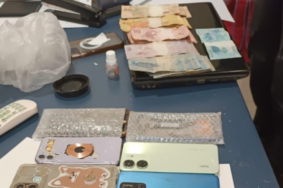 Entre os materiais apreendidos estão: 17 celulares de diversas marcas, um notebook, três tablets, dois pendrives, um caderno de anotações; 55 trouxinhas de substância aparentando ser crack, três invólucros de substância aparentando ser maconha; uma trouxinha aparentando ser maconha; cinco papelotes de substância aparentando ser cocaína (incluindo 1 médio), facas; uma arma caseira calibre 22 e um revólver calibre 38. Também foram apreendidos três tablets, pendrives, pepitas com aparência de ouro, uma motocicleta e dois carros, sendo um Astra e um Kadete.