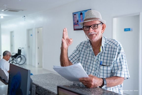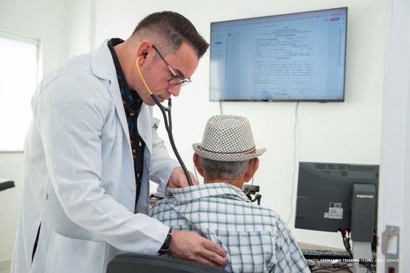 Em sua primeira consulta híbrida, Francisco Laerte de Oliveira, 75 anos, foi atendido por um médico cardiologista. Hipertenso há anos, ele procurou a UBS do bairro onde mora após sentir dores no peito e recebeu o encaminhamento ao Centro de Teleassistência. De lá ele saiu com todas as solicitações de exames e receitas médicas.