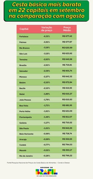 NACIONAL – Em âmbito nacional, as reduções mais expressivas em setembro ocorreram em Fortaleza (-6,31%), Palmas (-5,91%), Rio Branco (-3,16%), São Luís (-3,15%) e Teresina (-2,63%). Os menores valores médios foram registrados em Aracaju (R$ 552,65), Maceió (R$ 593,17), Salvador (R$ 601,74), Natal (R$ 610,27) e João Pessoa (R$ 610,93). O maior custo ficou em São Paulo (R$ 842,26).