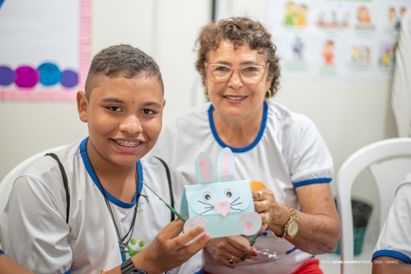 Os 110 integrantes do Cabelos de Prata e os 19 no Conviver participaram da roda de conversa sobre os símbolos da Páscoa. Em seguida, idosos voluntários ajudaram as crianças na produção de lembranças temáticas, momento que ressaltou a importância da aprendizagem entre gerações.
