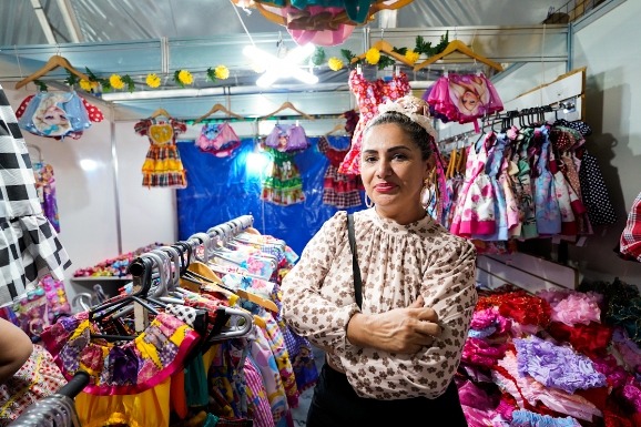 Edna Rodrigues tem uma loja de roupas de crianças e variedades. Ela aproveitou o Boa Vista Junina, encheu o stand com roupas típicas de arraial, partiu para trabalhar e se divertir.