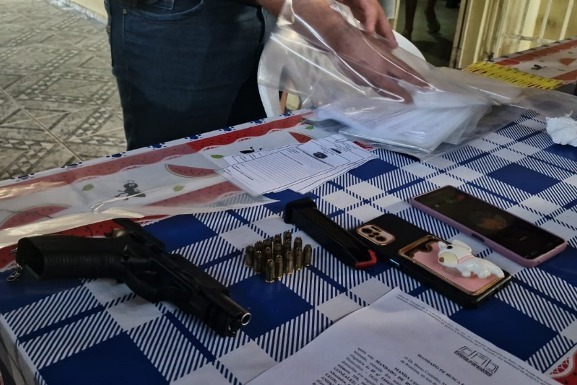No desdobramento das diligências dessa sexta-feira, os policiais localizaram uma casa no bairro Cidade Satélite, onde duas pessoas foram presas em flagrante por tráfico de drogas e posse de arma de uso restrito. São eles Y. R. C., de 30 anos e a jovem R. C. B. M, de 23 anos. Com eles foram apreendidas, além de drogas, uma pistola 9mm e munições. Os dois foram conduzidos à sede da DGH, onde foi lavrado um APF (Auto de Prisão em Flagrante) contra eles.
