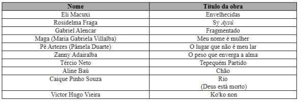 “Foi uma escolha difícil diante de tantos poemas e textos de qualidade excepcional e com temáticas tão variadas, de autores experientes e novos talentos que se fortalecem a cada ano. A literatura em Roraima se faz cada vez mais consistente”, disse Vanessa Brandão, curadora de Literatura.