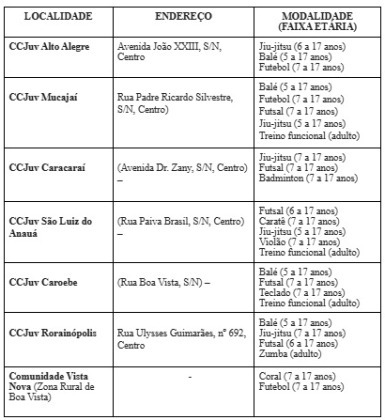 O Centro de Convivência da Juventude (CCJuv), vinculado à Assembleia Legislativa de Roraima (ALE-RR), abre nesta segunda-feira, 27, as inscrições para novos alunos nos polos localizados no interior do estado. Ao todo, são oferecidas 810 vagas gratuitas em modalidades culturais e esportivas voltadas para crianças de 5 a 17 anos e atividades específicas para adultos.