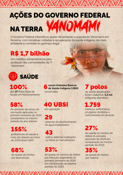SAÚDE COMO POLÍTICA — Paralelamente, os serviços de saúde passaram a ser garantidos como política pública, com notificações sistemáticas, planejamento e atendimentos. Desde 2023 foram reabertos sete polos de saúde que estavam desativados, o que garantiu atendimento a 5,2 mil indígenas. O número de óbitos por desnutrição foi reduzido em 68% entre os primeiros semestres de 2023 e 2024. Programas de imunização e combate à malária registraram avanços significativos.