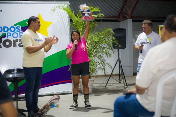 A atleta Thays Marques, campeã roraimense de skate 2025 na seletiva Norte, levou ao evento o troféu e a filha Laura, de 4 anos. Ela defendeu a criação da Federação de Skate em Roraima.