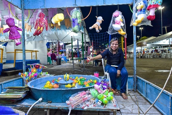 Para ampliar os negócios pessoais, Luiza Juliane Soares colocou a tenda da pescaria como alternativa de renda. Mesmo sendo apenas a segunda noite, ela falou sobre a expectativa de faturamento durante o evento.