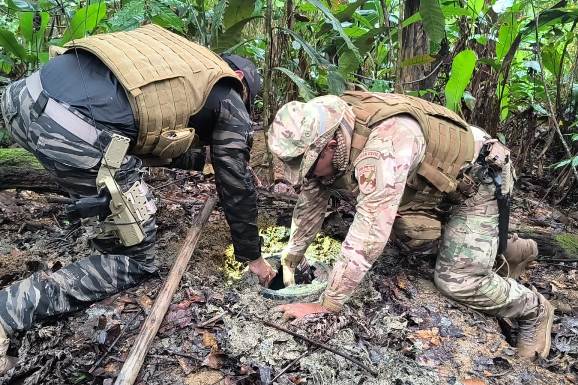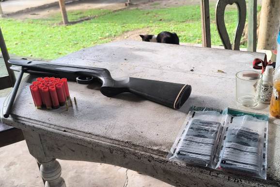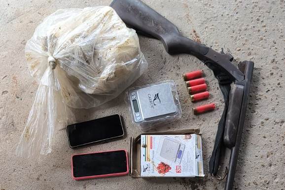 Do sítio dele, os policiais fizeram uma caminhada de 3 km, por dentro de uma mata densa, onde apreenderam uma balança de precisão e aproximadamente 4 quilos de cocaína. A droga estava enterrada em um tonel.