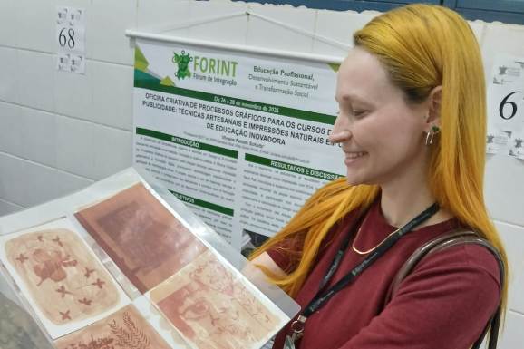 Outro destaque entre as iniciativas de ensino expostas foi o projeto “Oficina Criativa de Processos Gráficos para os Cursos de Design e Publicidade: Técnicas Artesanais e Impressões Naturais em Contexto da Educação Inovadora”, conduzido pela professora Viviane Paludo Shultz, do Campus Boa Vista Zona Oeste.
