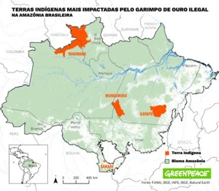 Panorama das áreas desmatadas pelo garimpo ilegal de ouro em territórios indígenas, 2023-2024. Fonte: Relatório “Ouro Tóxico”, do Greenpeace Brasil