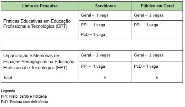 Estão sendo ofertadas 656 vagas, distribuídas entre as Instituições associadas ao programa presentes em todo o território nacional, destinadas à ampla concorrência e aos servidores pertencentes ao quadro permanente ativo das seguintes instituições da Rede Federal de Educação Profissional, Científica e Tecnológica: Institutos Federais de Educação, Ciência e Tecnologia, Centros Federais de Educação Tecnológica e Colégio Pedro II.