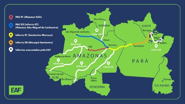 Atualmente, o Norte Conectado conta, ao todo, com a implantação de dez rotas interligadas que formarão um grande anel óptico na região amazônica, possibilitando a conexão de milhões de pessoas à internet. A EAF é responsável pela implantação das Infovias 02, 03 e 04 e 06, 07 e 08, e pela revitalização do Programa Amazônia Conectada, que será integrado ao Norte Conectado.
