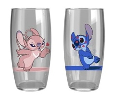 Copos de vidro, um com a Angel e outro com o Stitch, ideais para serem usados em momentos de união, trazendo mais diversão para o ambiente.