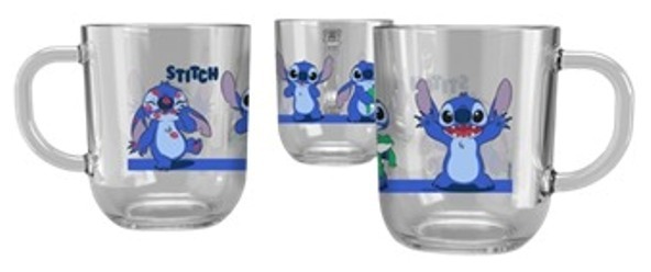 Caneca de Vidro com estampa 360°, trazendo diversas artes diferentes do Stitch, cada uma expressando uma emoção única do personagem.