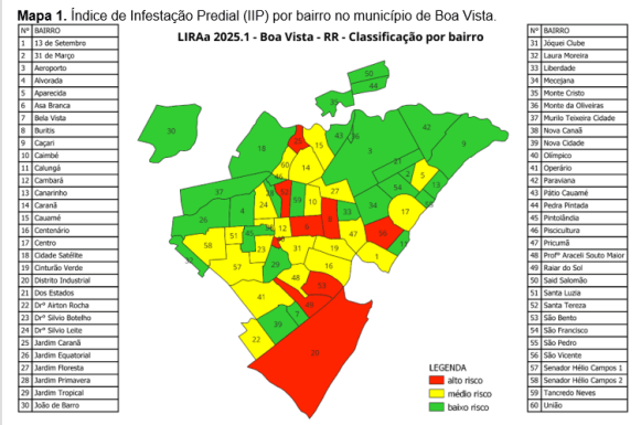 O resultado do primeiro levantamento do ano apontou ainda que, dos 60 bairros de Boa Vista, 30 foram classificados com baixo risco, 21 com médio risco e 9 com alto risco, fechando o Índice de Infestação Predial (IIP) em 2%.