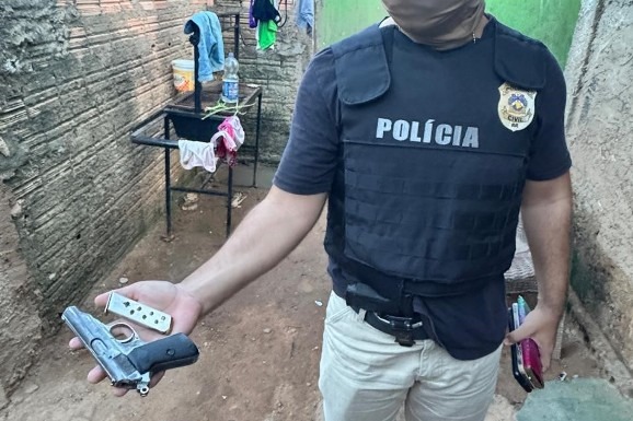 Durante o cumprimento dos mandados judiciais, os agentes localizaram na residência de J.J.R. uma pistola calibre 380, levando à sua prisão em flagrante por porte ilegal de arma de fogo.