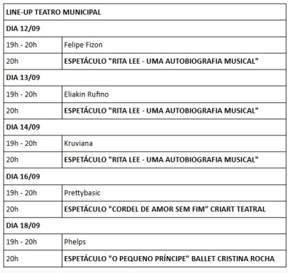 O pontapé inicial do evento ocorre no dia 12 de setembro, às 19h, com apresentação do cantor Felipe Fizon e do espetáculo “Rita Lee – Uma Autobiografia Musical”. Eliakin Rufino, Kruviana, Prettybasic e Phelps, além dos espetáculos “Cordel de Amor Sem Fim”, da Cia Criart Teatral e “O Pequeno Príncipe”, do Ballet Cristina Rocha, também estão na programação do Teatro Municipal, que segue até 18 de setembro.