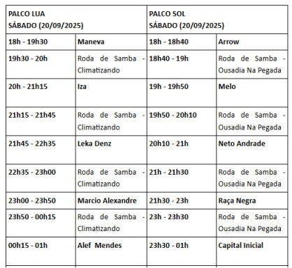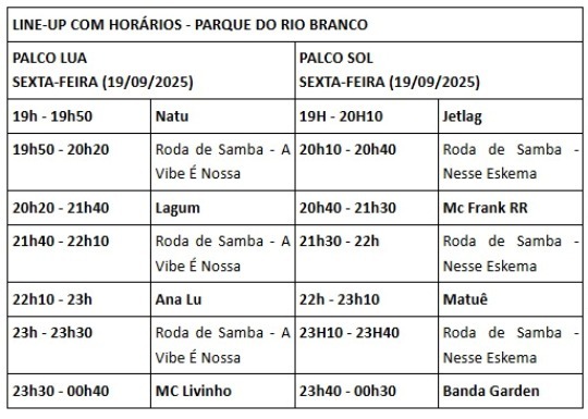 Seguindo para o Parque do Rio Branco, no dia 19 de setembro, evento ocorrerá de forma simultânea nos palcos Sol e Lua, com apresentações de artistas nacionais, como Iza, Lagun, Raça Negra, Matuê, Capital Inicial, dentre outros e artistas da terra. O festival contará ainda com a Arena Hip Hop, teatro de rua, intervenções, Mormacinho e aula show com o chef de cozinha Felipe Bronze.