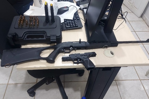 No local, os policiais localizaram uma pistola calibre 9mm, marca Taurus, e um rifle calibre 22. Além das armas, foram apreendidas munições compatíveis com ambos os armamentos, sendo parte delas encontradas no carregador da pistola.