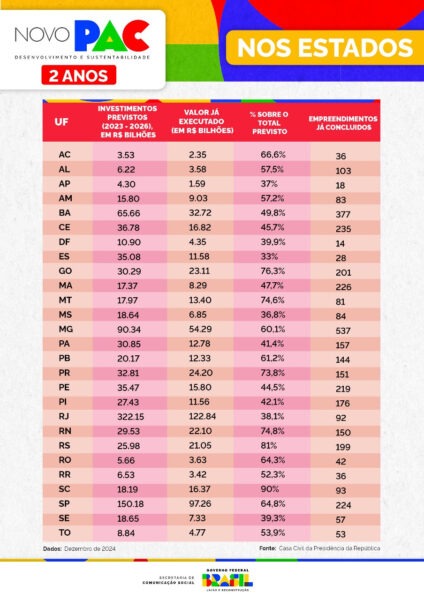 ATUALIZAÇÃO – O site do Novo PAC foi atualizado com informações até dezembro de 2024 e conta com novos dados por empreendimentos, como estimativa do valor total, estágio da obra, percentual de execução, classificação e tipo de executor.