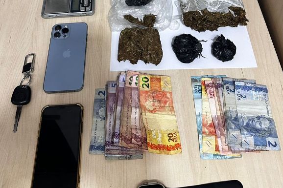 Foram presos B.S.M., de 26 anos, e R.D.S.S., de 24 anos, e apreendidos droga, balança de precisão e dinheiro em espécie.