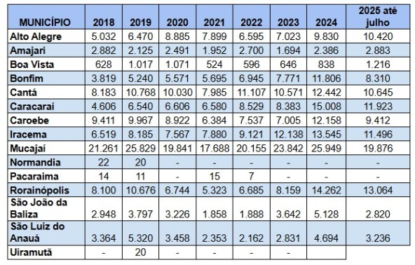 Entre os municípios, Mucajaí lidera com 19.876 bovinos abatidos, seguido por Rorainópolis (13.064) e Caracaraí (11.923). Na sequência estão Iracema (11.496), Cantá (10.645), Alto Alegre (10.420), Caroebe (9.412), Bonfim (8.310), São Luiz do Anauá (3.236), Amajari (2.883), São João da Baliza (2.820) e Boa Vista (1.216).