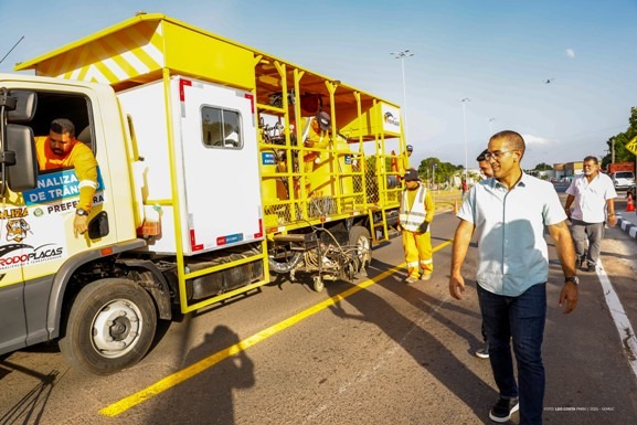 Mas não para por aí. A revitalização de cerca de 1.500 metros de sinalização horizontal e vertical está em ritmo acelerado. Faixas de pedestres, marcas de canalização e linhas divisórias de eixo e bordo tornam o trânsito mais seguro.