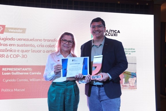 1º Lugar: Luan Guilherme Correia (Política Macuxi) com o trabalho: “Refugiado venezuelano transforma pedras em sustento, cria coletivo amazônico e quer levar o artesanato de RR à COP-30”. Equipe: Cyneida Correia e William Roth.