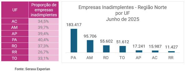 O Norte do país encerrou junho de 2025 com 430.902 empresas negativadas, de acordo com o Indicador de Inadimplência das Empresas da Serasa Experian, primeira e maior datatech do Brasil. O Pará foi o estado com a maior proporção de negócios no vermelho (40,4%). Em seguida, ficaram o Amazonas (39,7%) e o Amapá (39,4%). Roraima registrou o menor índice da região, com 26,7% das empresas com dívidas em aberto. Veja os números de todas as Unidades Federativas (UFs) da região a seguir: