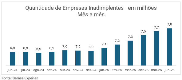No cenário nacional, junho de 2025 registrou um novo recorde histórico, com 7,8 milhões de empresas com contas em atraso, equivale a 32,9% das companhias existentes no país. A economista-chefe da Serasa Experian, Camila Abdelmalack, fala que os dados de inadimplência refletem de forma concreta os efeitos da política monetária restritiva. “Como uma correnteza que começa com o aperto financeiro nos negócios, a deterioração avança e deságua na inadimplência que, em junho de 2025, atingiu este patamar recorde de CNPJs. O ambiente de maior seletividade por parte dos credores pode ter limitado as possibilidades de negociação, contribuindo para este aumento”.