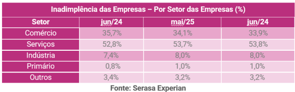 O levantamento revelou, ainda, que a maioria das companhias negativadas em junho 2025 era de “Serviços” (53,8%), seguido pelo “Comércio” (33,9%). Veja, na tabela abaixo, a comparação mensal e anual desta visão: