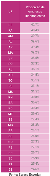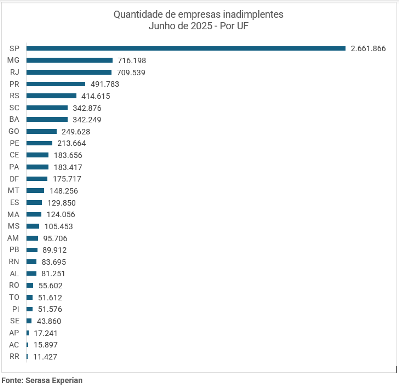 Na análise por Unidades Federativas (UFs), apesar de São Paulo (2.661.866) ter liderado o ranking em número de empresas inadimplentes em junho de 2025, o Distrito Federal apresentou a maior proporção (42,7%). Veja, no gráfico abaixo e na tabela a seguir, os dados completos: