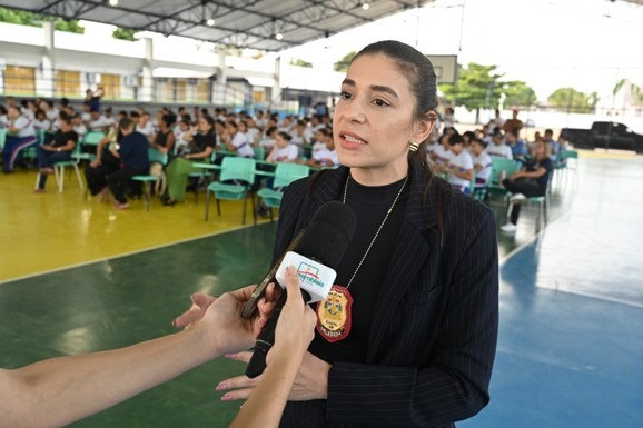 A Polícia Civil é instituição parceira do Programa de Defesa dos Direitos Humanos e Cidadania da ALERR. A delegada adjunta da Delegacia Especializada de Atendimento à Mulher (Deam), Kamilla Basto, foi convidada para falar com os estudantes sobre o papel da instituição diante dos crimes.