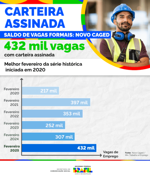 NACIONAL — O Brasil gerou 431,9 mil postos de trabalho com carteira assinada em fevereiro. É o número mais expressivo para o mês da série histórica do Novo Caged. O resultado é superior às 307 mil vagas de fevereiro de 2024, às 252 mil registradas no mesmo mês em 2023, às 353 mil de 2022, às 397 mil de 2021 e às 217 mil de 2020.
