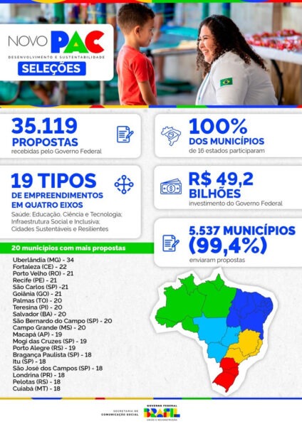 O Governo Federal recebeu 35.119 propostas para a segunda edição do Novo PAC Seleções 2025, enviadas por 5.537 municípios — um total que corresponde a 99,4% das cidades do país. Os projetos foram encaminhados por gestores e gestoras entre 24 de fevereiro e 31 de março. O programa vai investir R$ 49,2 bilhões em 19 tipos de empreendimentos, organizados em quatro eixos: Saúde; Educação, Ciência e Tecnologia; Infraestrutura Social e Inclusiva; Cidades Sustentáveis e Resilientes.