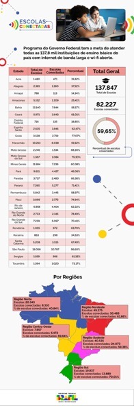REGIÕES — A Região Sul apresenta o maior percentual de escolas conectadas. Ao todo, Paraná, Rio Grande do Sul e Santa Catarina registram 13.889 escolas conectadas de um total de 19.837, o equivalente a 70%. Em seguida aparecem as regiões Centro-Oeste, com 7.857 escolas, das quais 5.472 estão conectadas (69,64%), Nordeste (49.275 escolas, 32.775 conectadas – 61,86%), Sudeste (40.535 escolas, 24.073 conectadas – 59,38%) e Norte (20.343 escolas, 8.310 conectadas – 40,84%).
