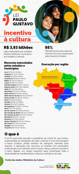 “A lei é responsável pelo desenvolvimento econômico, social e artístico ao injetar recursos financeiros nos municípios e estados, gerando emprego, renda e dignidade para o nosso povo”, ressalta a ministra da Cultura, Margareth Menezes. “A cultura está diariamente na vida dos brasileiros. Por isso, leis de incentivo, como a Paulo Gustavo, são importantes para contribuir com políticas de fomento cultural, fazendo chegar em todo território nacional, e evidenciar a diversidade da nossa gente e as diferentes formas de se fazer cultura”, completa a ministra.
