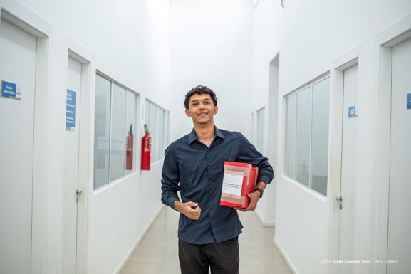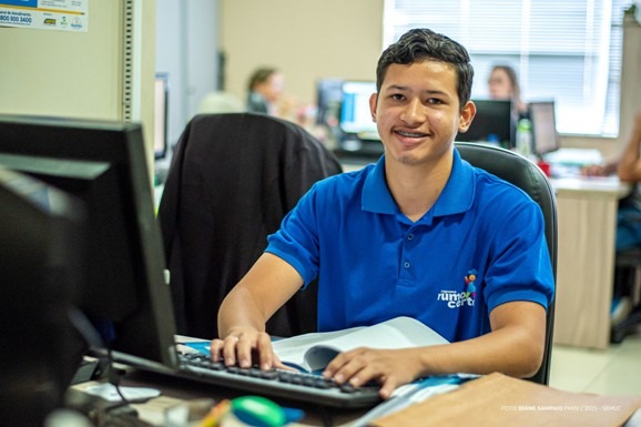 Kaylan Ribeiro, de 18 anos, é outro exemplo de sucesso do Rumo Certo. Ele passou por instituições parceiras até chegar à Secretaria Municipal de Gestão Social (SEMGES), onde atua mesmo com o fim do estágio. Segundo ele, a experiência do primeiro emprego é única.