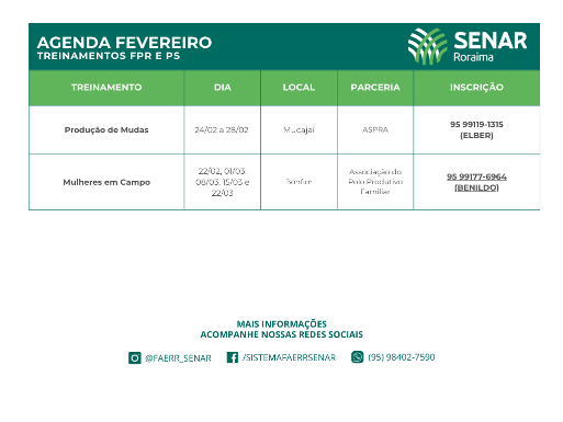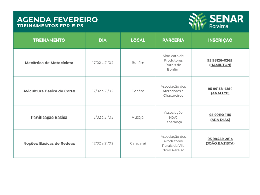 O Serviço Nacional de Aprendizagem Rural (Senar/RR) está com inscrições abertas para diversos treinamentos gratuitos de Formação Profissional Rural (FPR) e Promoção Social (PS) que serão realizados na segunda quinzena de fevereiro. As capacitações abrangem diferentes áreas do setor rural e acontecem em vários municípios do estado, oferecendo qualificação profissional aos participantes.