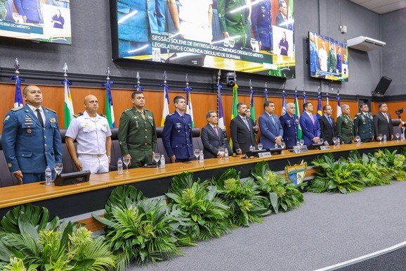 A Assembleia Legislativa de Roraima (ALE-RR) promoveu, na manhã desta quinta-feira, 20, uma sessão especial para a entrega de honrarias a duas autoridades do Superior Tribunal Militar (STM). O evento, proposto pelo deputado Marcos Jorge (Republicanos), aconteceu no Plenário Deputada Noêmia Bastos Amazonas e contou com a presença de parlamentares e autoridades de diversos órgãos públicos estaduais e federais.