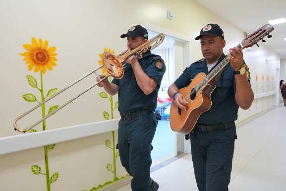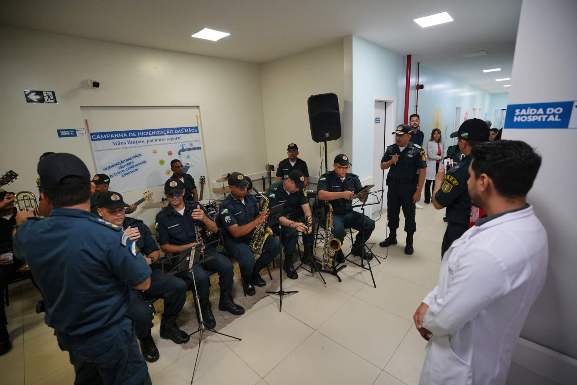 As ações do projeto Som da Fé continuam levando acolhimento e bem-estar aos ambientes hospitalares de Roraima. Na manhã desta segunda-feira, 9, foi a vez do Hospital Materno Infantil Nossa Senhora de Nazareth, receberam a visita especial da Banda de Música da Polícia Militar de Roraima.