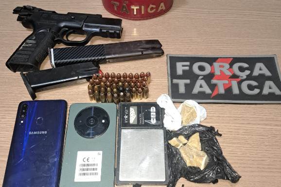 Na sequência, o suspeito J.G.S.A., homem venezuelano de 28 anos, foi localizado escondido em um quintal desabitado, em posse de uma pistola calibre 9 mm, dois carregadores e 45 munições. No trajeto da fuga, a Polícia Militar encontrou dois invólucros com pasta base de cocaína, celulares e balança de precisão. O homem confessou ser o proprietário da droga e informou que realizava a venda do entorpecente.