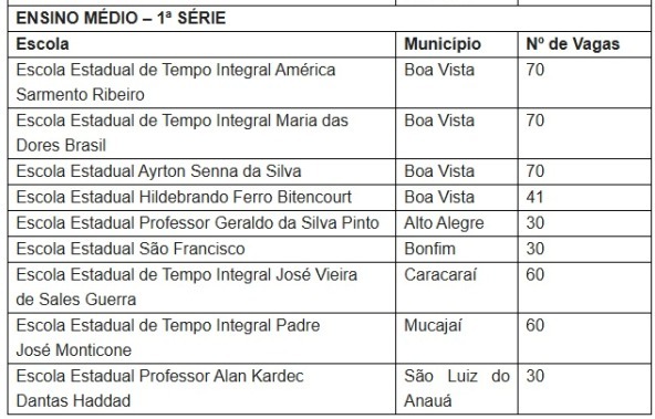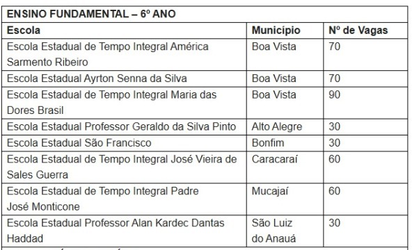 Na capital Boa Vista, quatro escolas estaduais ofertam o Ensino Integral, com um total de 481 vagas. As escolas do interior do estado também ofertam vagas para o Ensino Fundamental e Médio em Tempo Integral, com destaque para os municípios de Alto Alegre, Bonfim, Caracaraí, Mucajaí e São Luiz do Anauá, totalizando 901 vagas.