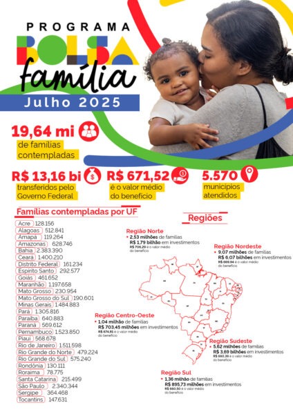 Em julho, mais de 19,6 milhões de famílias, de todos os 5.570 municípios brasileiros, serão atendidas, por meio de um investimento de R$ 13,1 bilhões por parte do Governo Federal. O valor médio do benefício no Brasil é de R$ 671,52.