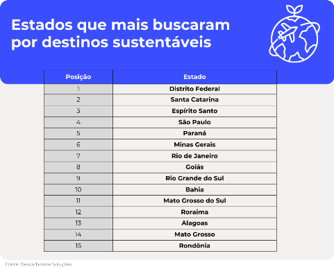 Já entre os estados que mais procuram pelos estabelecimentos comprometidos com o meio ambiente, o Distrito Federal ocupa a primeira posição do ranking. E os catarinenses não se destacam apenas por estarem entre os estados que mais possuem destinos sustentáveis, eles também ocupam a segunda posição entre os que mais procuram por eles. Ainda na região Sul, o Paraná também ocupa lugar de destaque na quinta posição. Fechando o pódio, Espírito Santo e São Paulo ficam na terceira e quarta posição, respectivamente, representando o Sudeste.