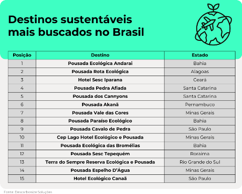 Dentre os destinos sustentáveis mais buscados no país, as pousadas e hoteis que lideram o ranking se encontram no estado da região Nordeste, liderado pela Bahia, seguido de Alagoas e Ceará. Na sequência, fechando o top cinco, aparecem estabelecimentos localizados no estado de Santa Catarina, na região Sul do país.