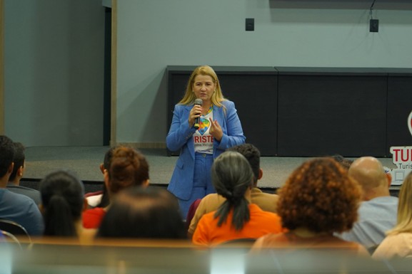 A palestra de abertura teve como tema “Autismo e Inclusão Social: Perspectivas e Modelos de Compreensão”, ministrada pelas servidoras Ana Lídia Mendanha e Letícia Fonseca, do Teamarr. A atividade buscou explicar o conceito de TEA, suas principais características e como os profissionais do turismo podem acolher pessoas atípicas durante suas atividades.